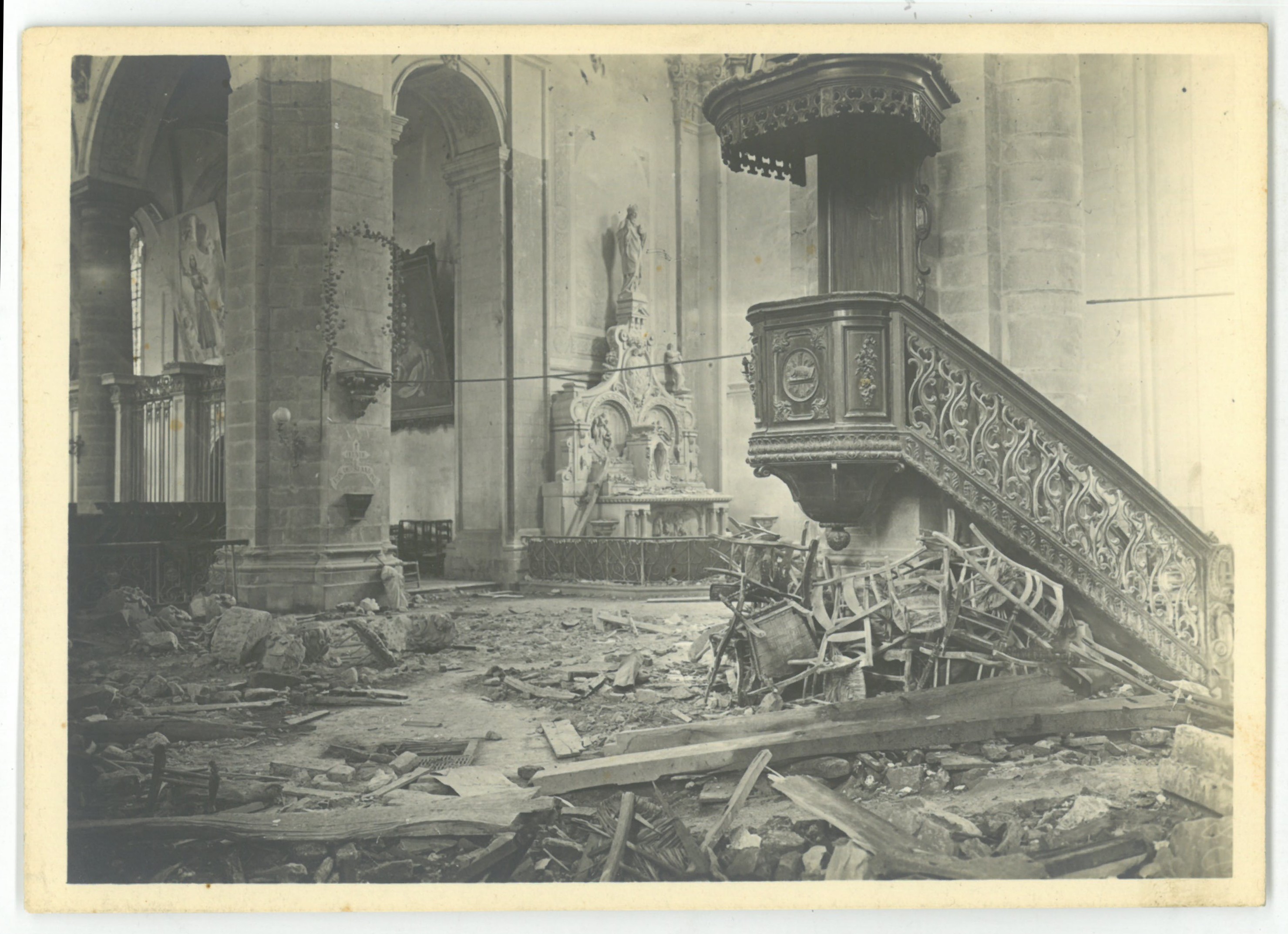 La chaire de l' Abbatiale Saint-Martin endommagée lors de la libération 1918.