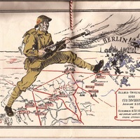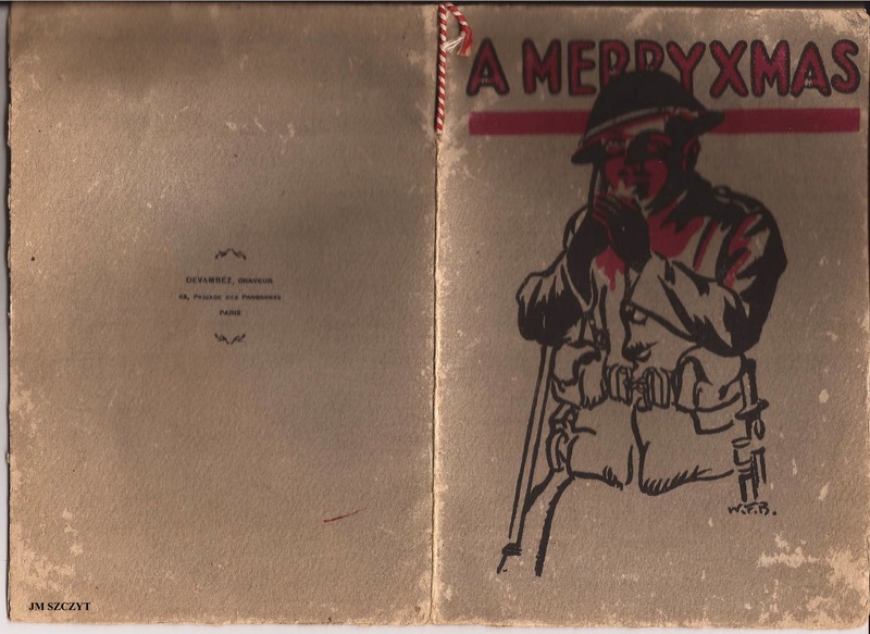 Carte de voeux de Noël anglaise, illustrée par un soldat anglais marchant sur une carte partant de Hamel vers Berlin représentant la rivière Selle comme frontière, ligne de front, au moment des voeux.