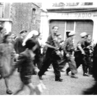 Troupe de FFI défilant dans une rue du Cateau à la libération en 1944