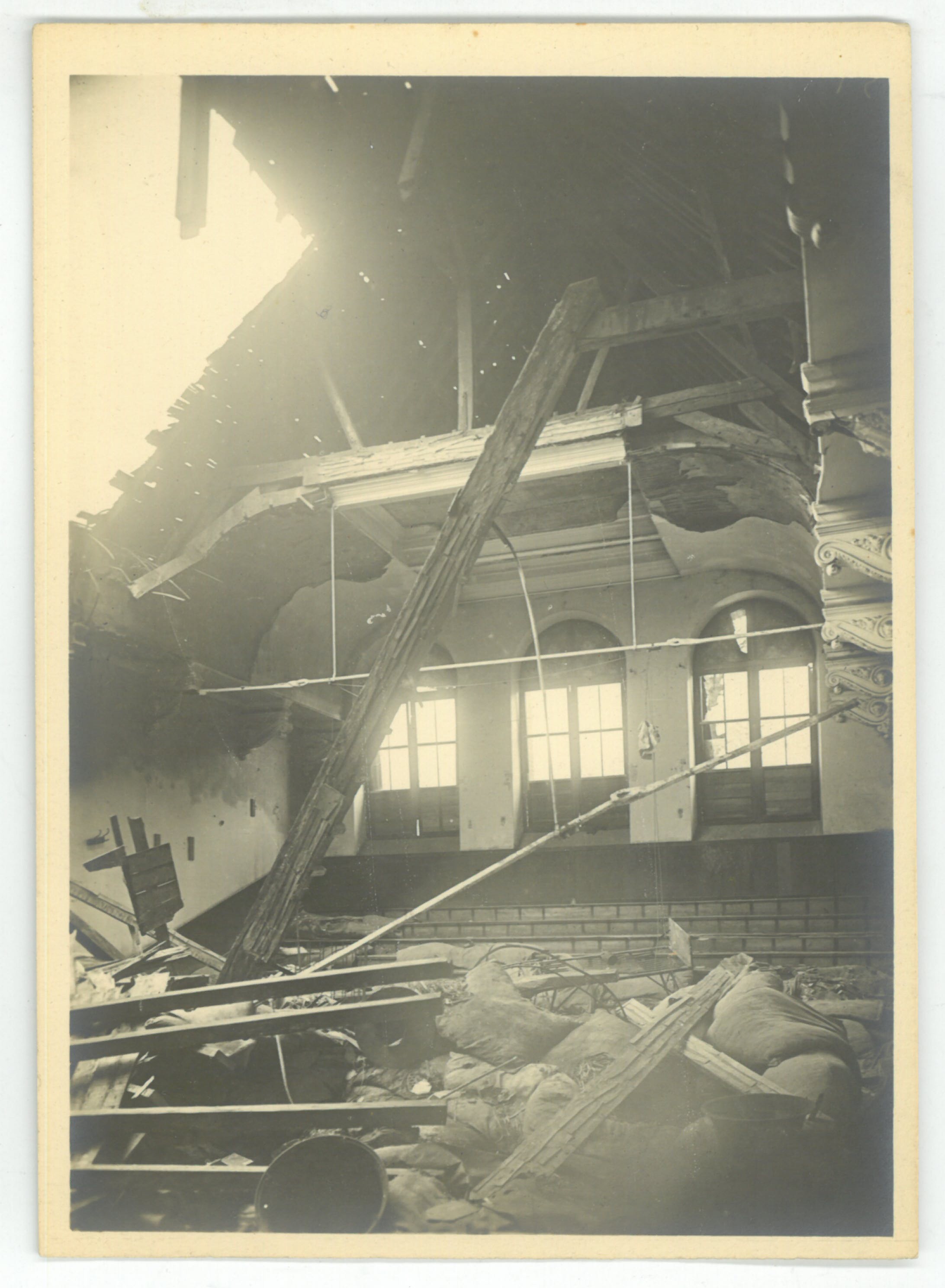 Une classe maternelle détruite vue du plafond lors de la libération 1918.