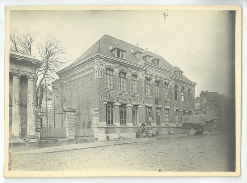 L’école des filles, l'actuel Musée Matisse, devant avec une bande d'enfants et un camion anglais endommagé lors de la libération 1918.