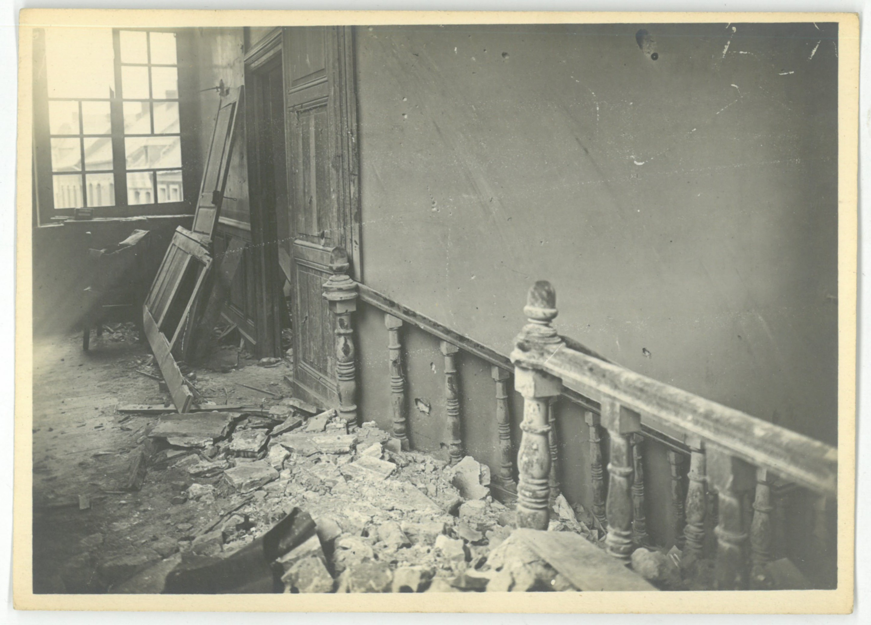Le palier de l’hôtel de ville endommagé lors de la libération en 1918.
