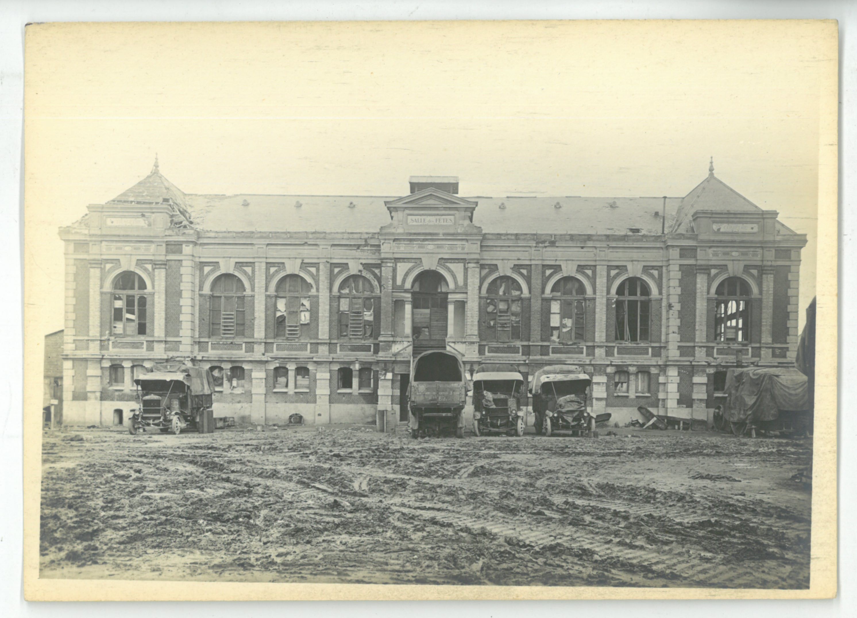La façade de la salle des fêtes vue de l'extérieur avec cinq camions garés devant endommagée lors de la libération de 1918.