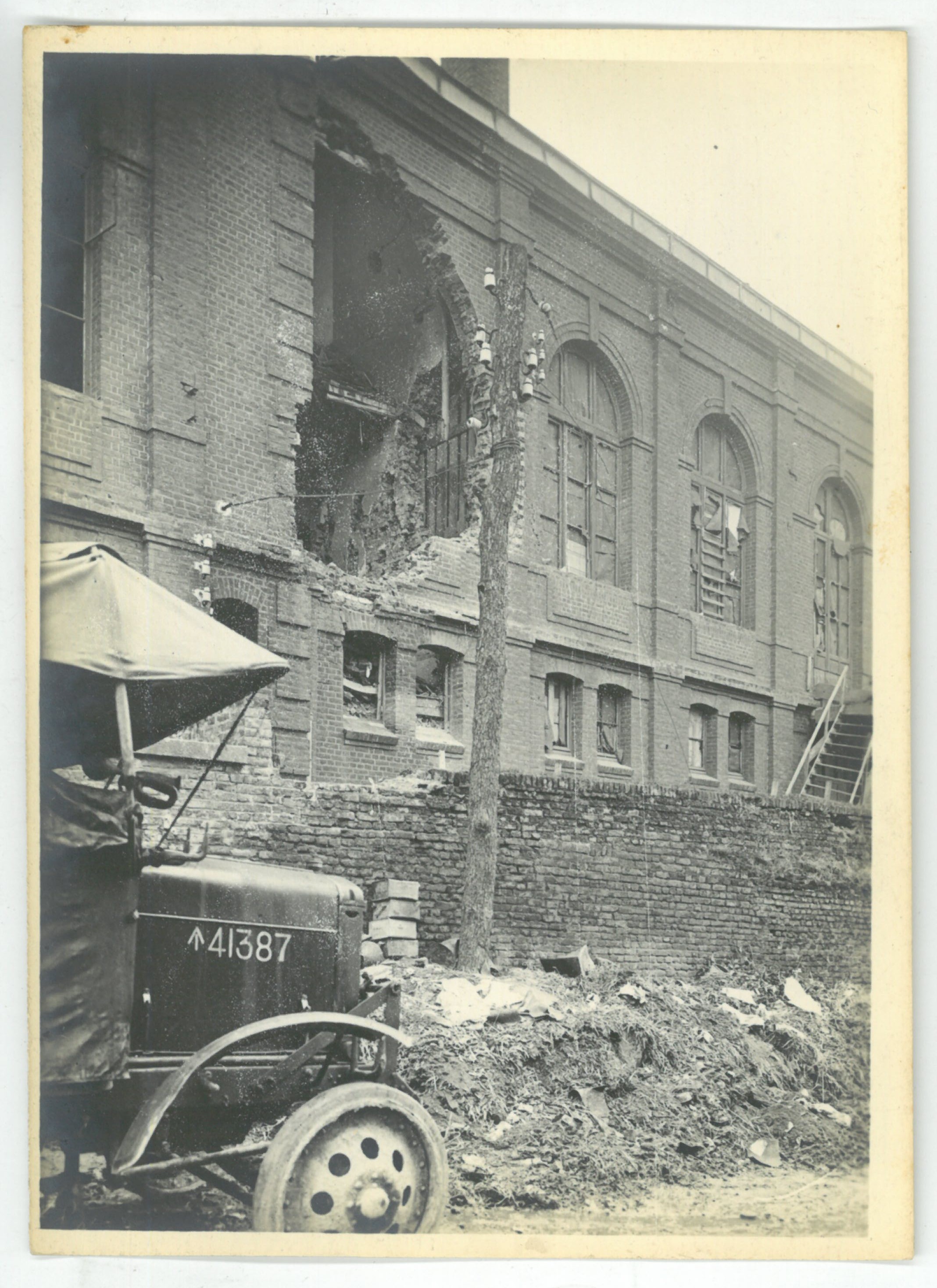 La partie extérieur de la salle des fêtes rue des remparts avec un véhicule anglais endommagée lors de la libération 1918.