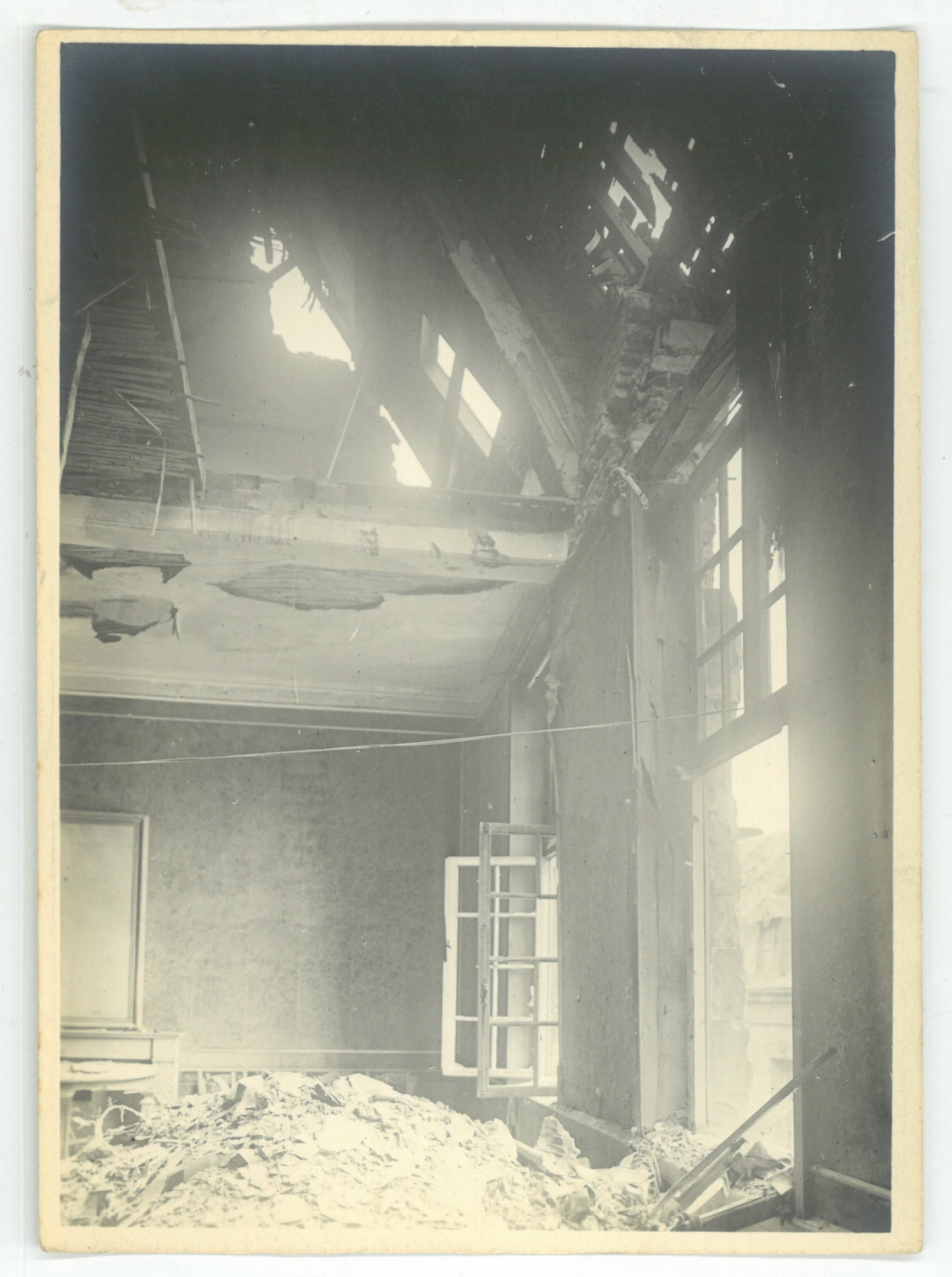 Une salle intérieure de l' Hôtel de ville endommagée lors de la libération de 1918.