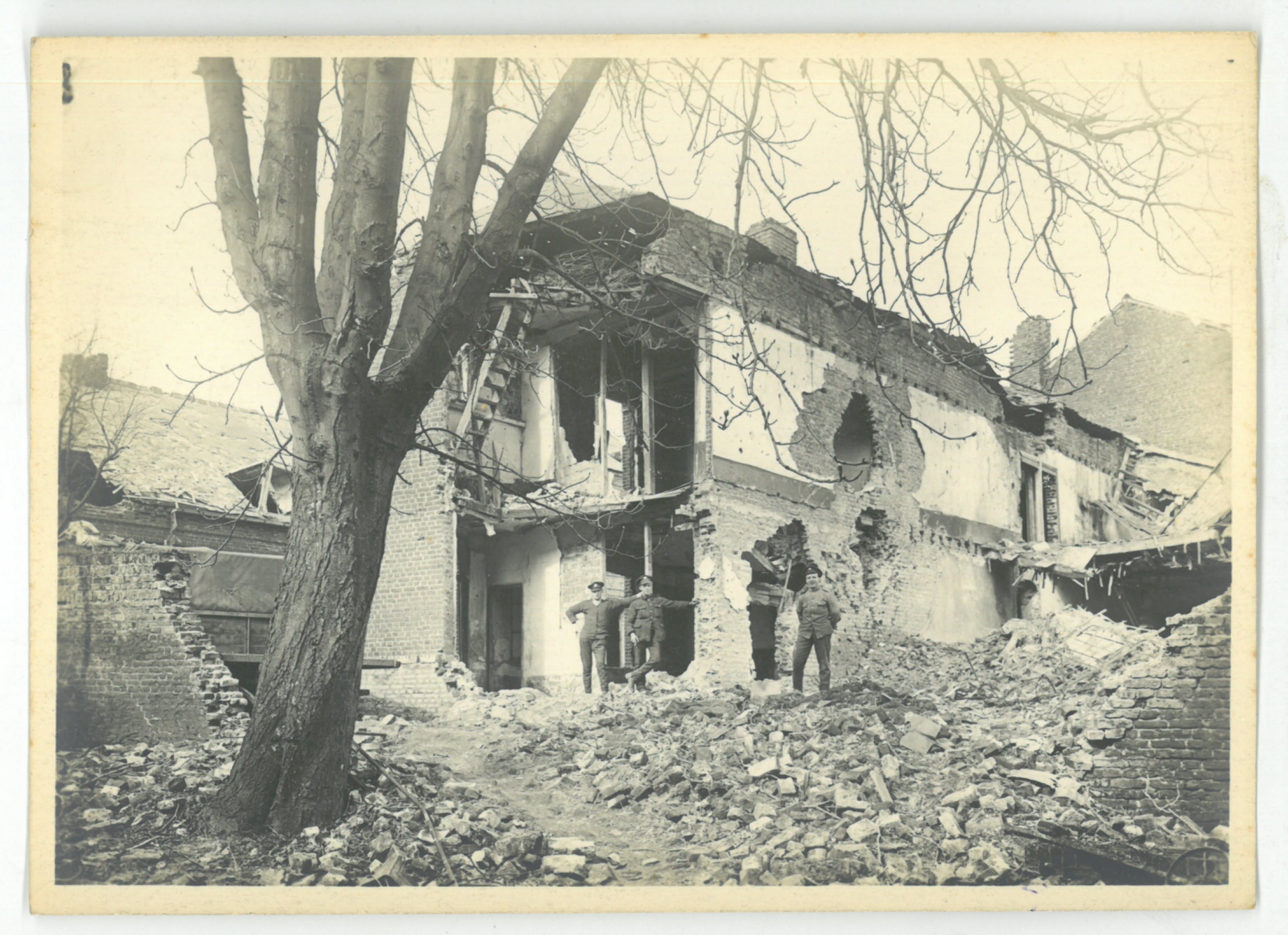 Un bâtiment non-identifiable avec des soldats anglais endommagé lors de la libération 1918.