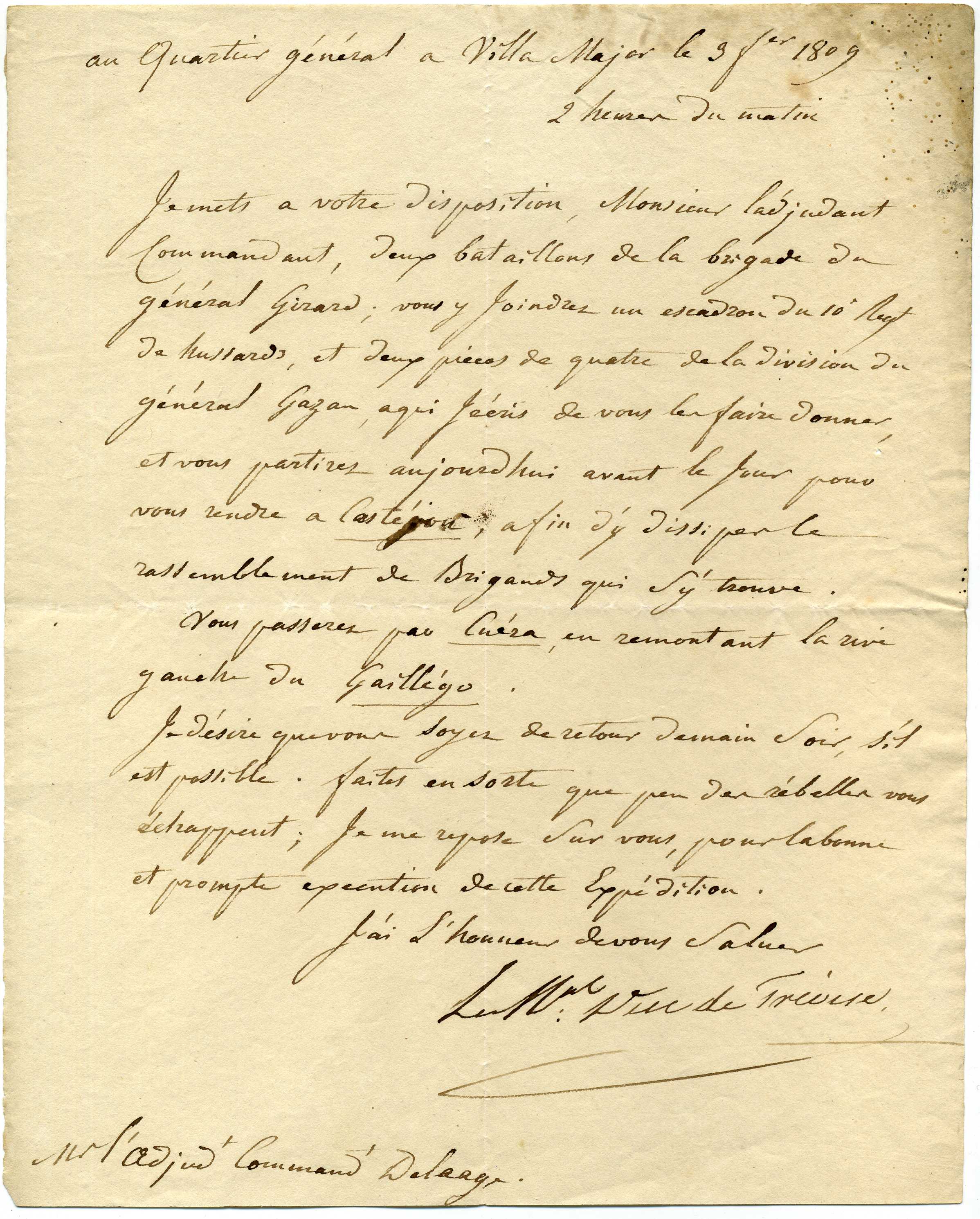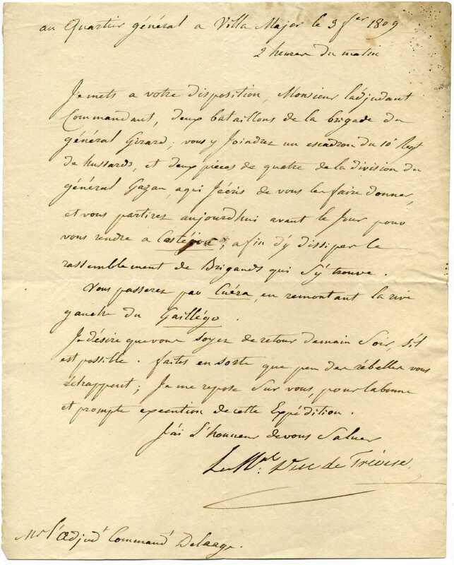 Lettre du Maréchal Mortier au QG à Villa Major