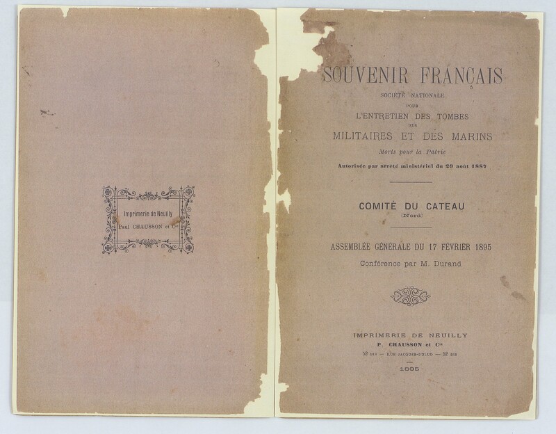 Livret de la conférence de M. Durand sur l'entretien des tombes des militaires et marins dont la société nationale a pour président d'honneur d'honneur M. Charles Seydoux.