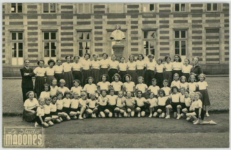 Société de gymnastique mixte, 'La Catésienne', Le Cateau, groupe de jeunes filles dans le jardin public, 1946