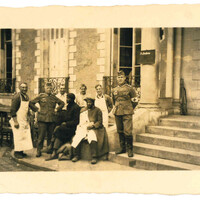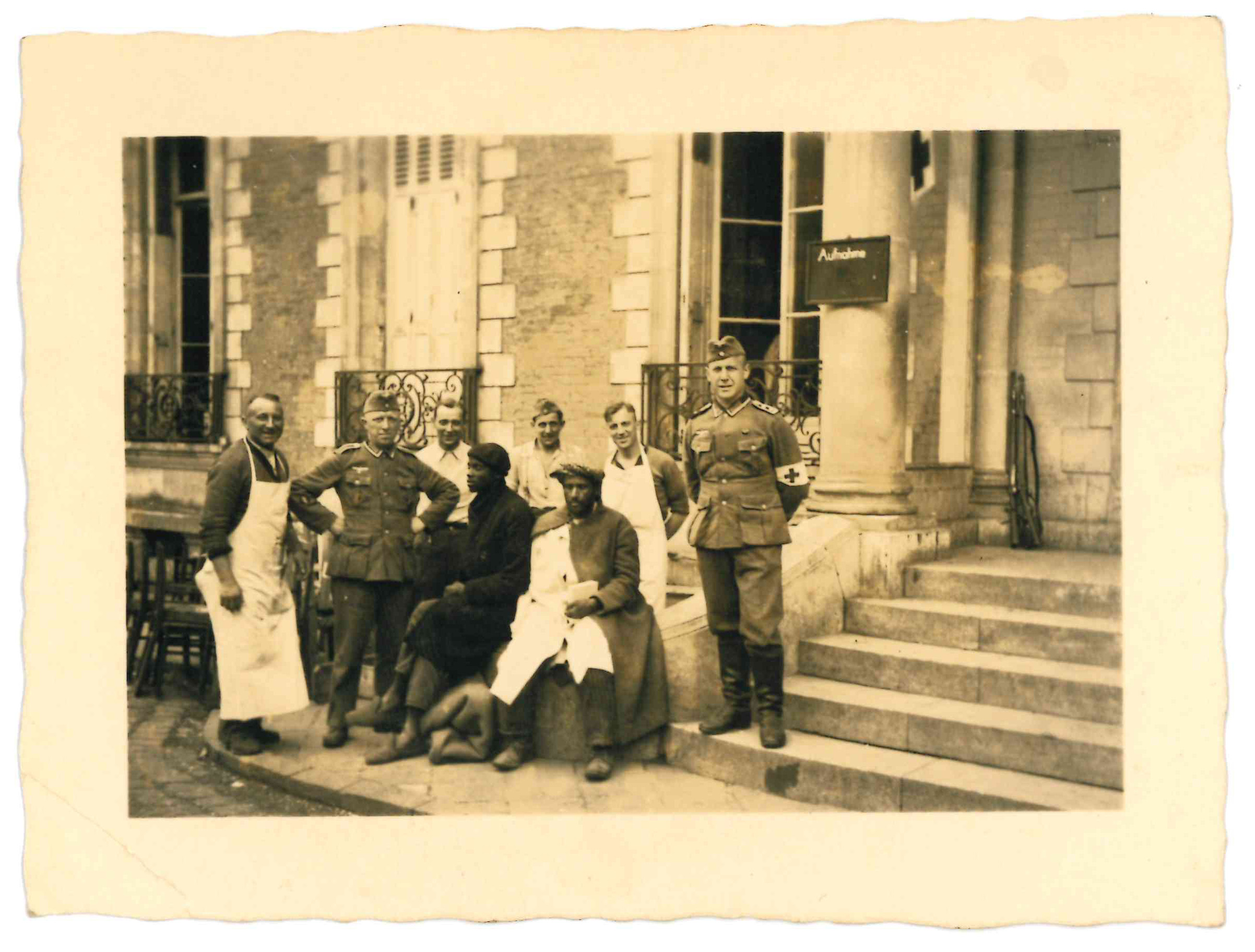 Photographie de deux soldats marocains blessés encadrés par du personnel soignant de la Wehrmacht