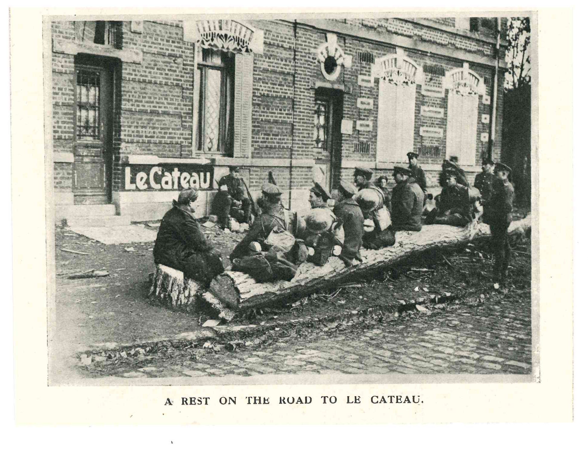 Coupure d'une revue anglaise de 1918 représentant des soldats britanniques assis devant une maison avec le panneau "Le Cateau"