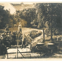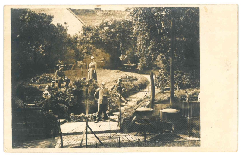 Soldats allemands et femme de service posant dans un jardin bourgeois en 1916