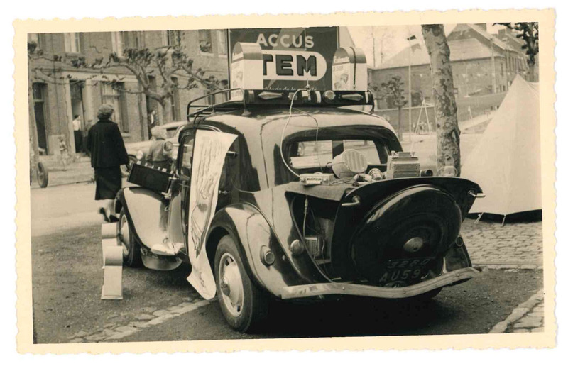 Vue arrière, sur la sono., d'une voiture 'Radiomatic' exposée lors d'un rallye international en 1935