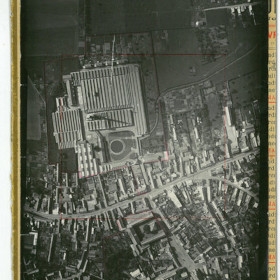 Vue aérienne du Cateau centrée sur l'usine Seydoux et le centre-ville