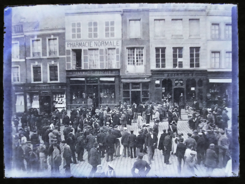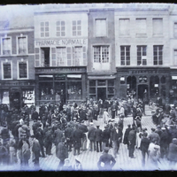 Rassemblement sur la place publique autour de gendarmes coiffés de bicornes.