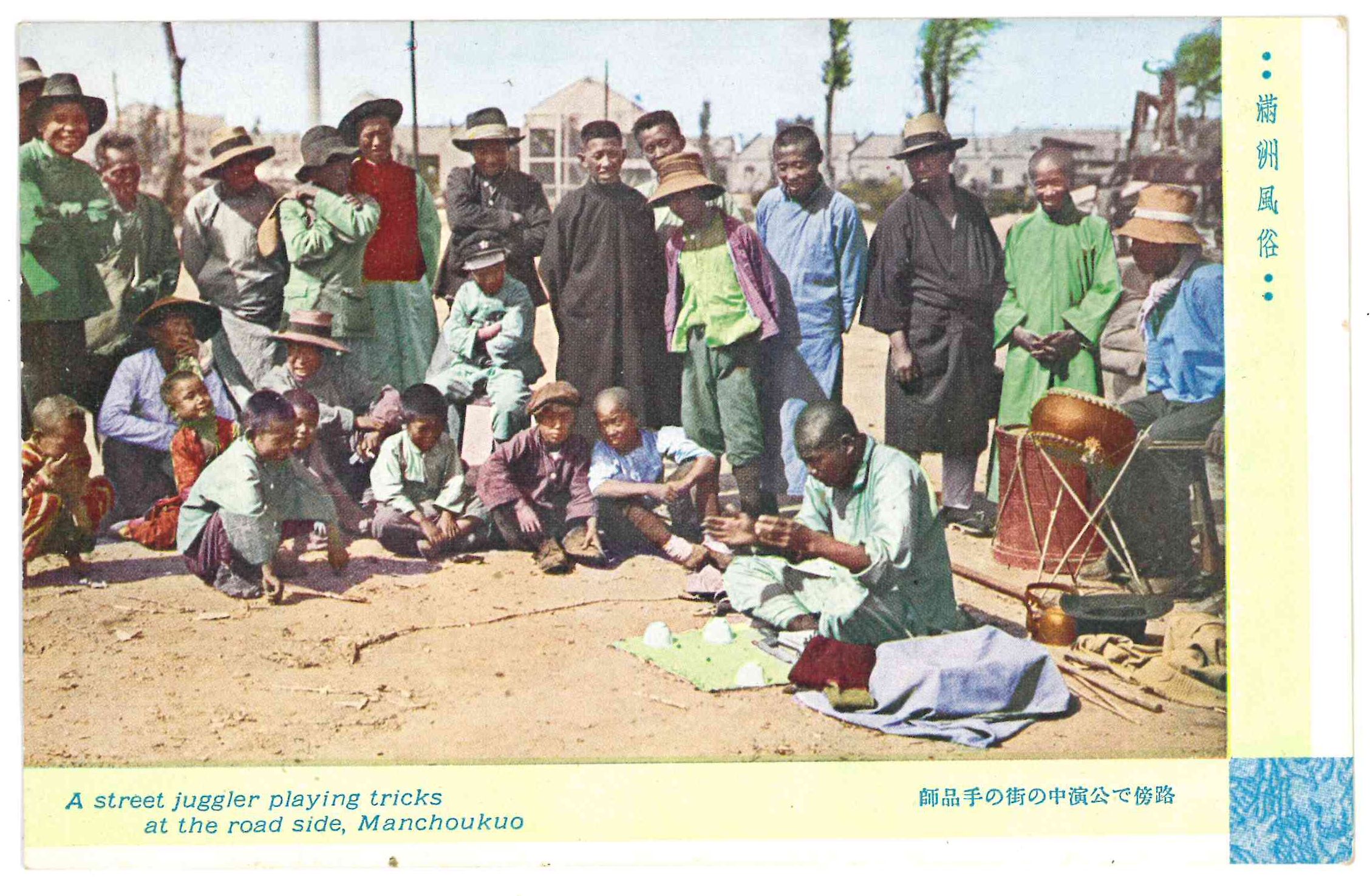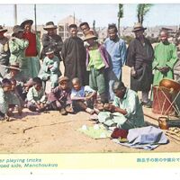 A street juggler playing tricks at the road side, Manchoukuo