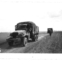 Convoi américain accompagné d'un soldat à pied aux alentours du Cateau