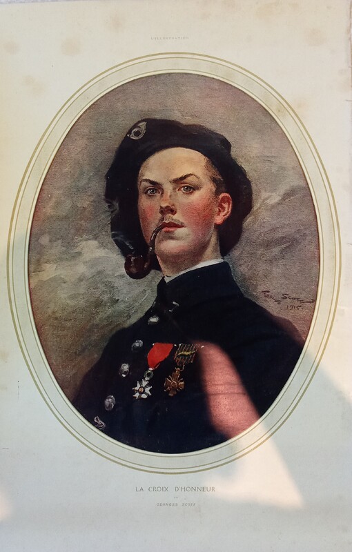 Peinture, réalisée par Georges Scott en 1915, illustre un jeune soldat, nommé Paul Charrin, fumant la pipe recevant la croix d'honneur. Ce dernier était un agent de liaison sur la frontière avec l'Alsace.