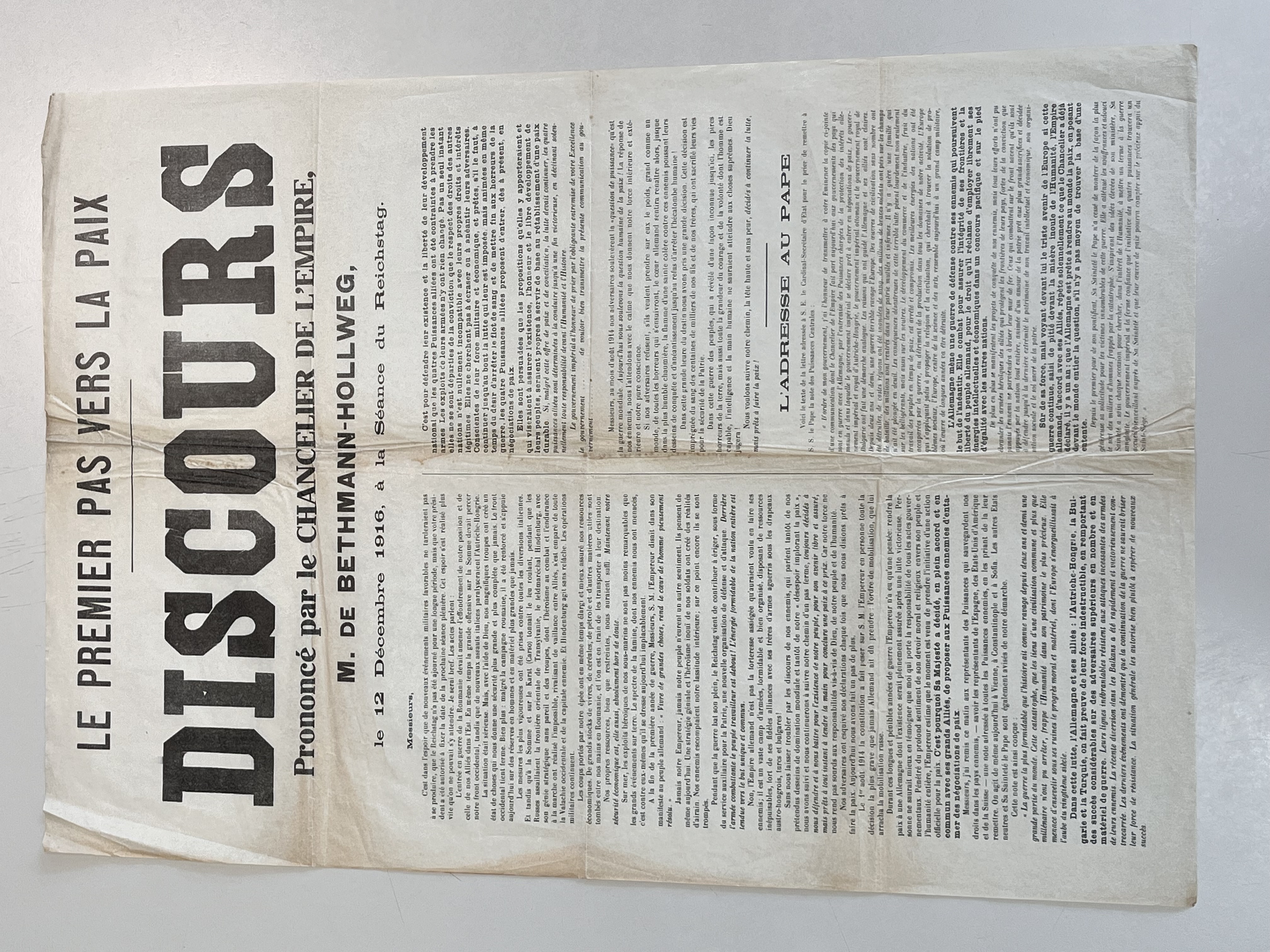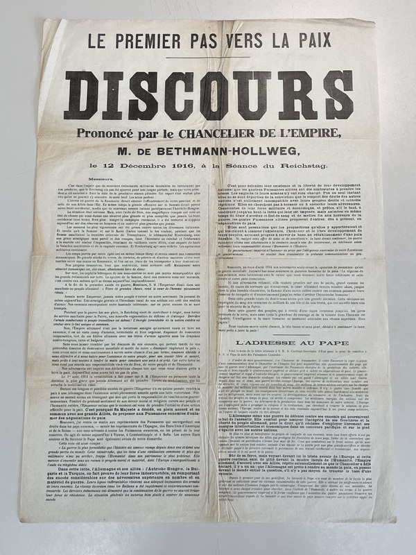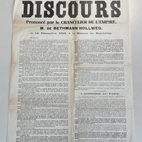 Discours du chancelier M. de Bethmann-Hollweg concernant la situation de l'Allemagne en 1916 en pleine Première Guerre mondiale.