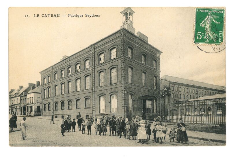 Carte postale ancienne montrant le bâtiment principal de l’usine Seydoux au Cateau, visible depuis la rue principale. L’architecture évoque un bâtiment administratif à l’entrée du complexe industriel. Scène de rue calme, quelques passants visibles.