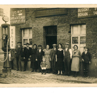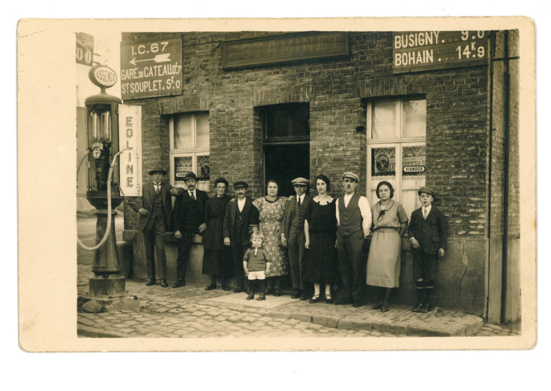 Pompe à essence Eoline et population devant un estaminet du Cateau