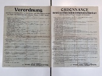 L'ordonnance du 13 juin 1917 au Cateau-Cambrésis expose l'occupation allemande dans la ville. Cette ordonnance réquisitionne aux Catésiens les objets d'installation, de ménage en cuivre et d'alliages en cuivre dans le but de produire tout sorte de munitions et d'armes pour les allemands.Créateur : von der Marwitz, Georg (1856-1929)Date : 1917-06-13Type : Publication en série impriméeMots‑clés : Éphémères, France, Occupation, Première Guerre mondiale, Société, Carte postale allemande -